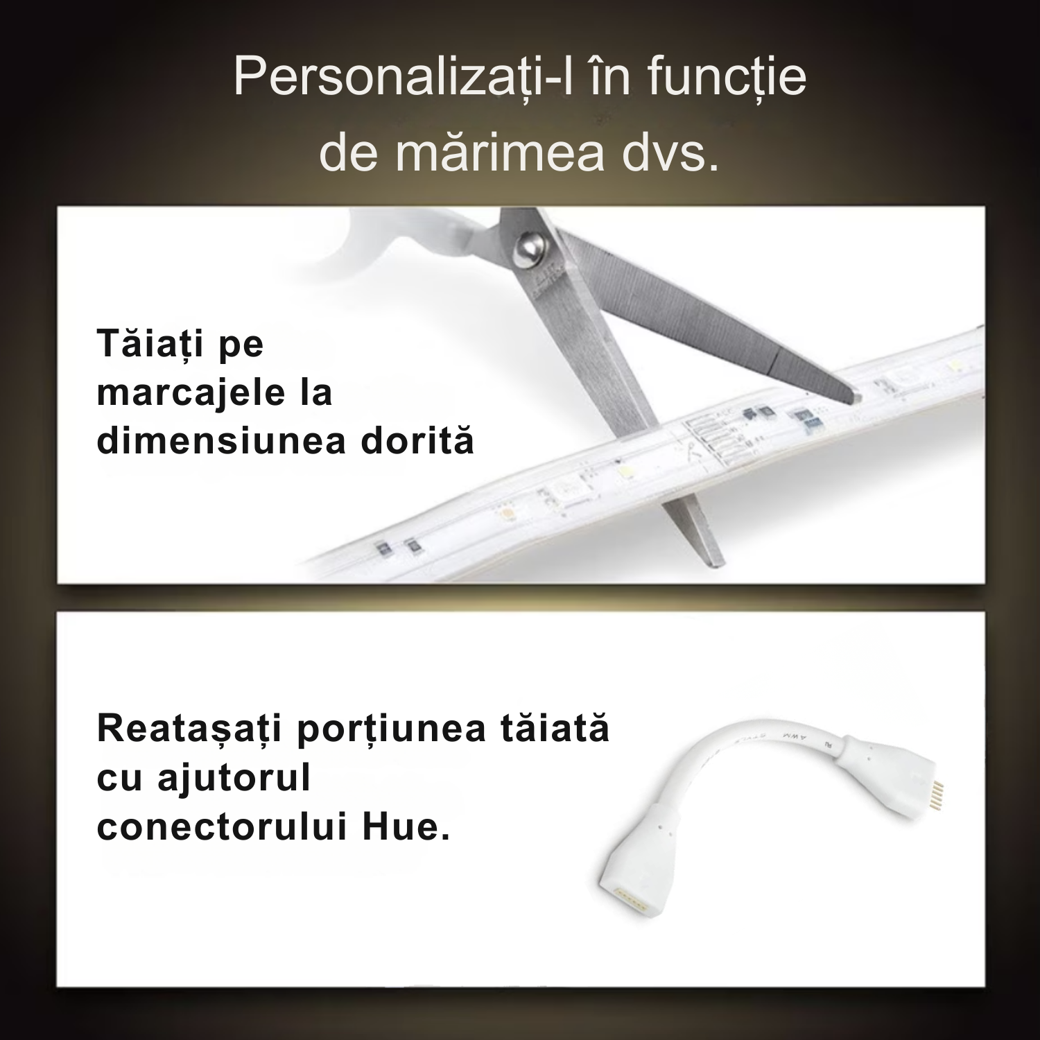 • Extindeti-va Philips Hue Lightstrip Plus Bluetooth Gen.4 folosind acest kit de extensie de 1 metru pentru a acoperi suprafete mai mari ( extensibile pana la 10 metri ).