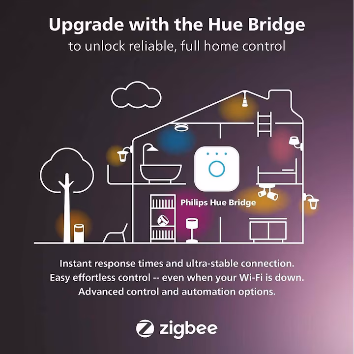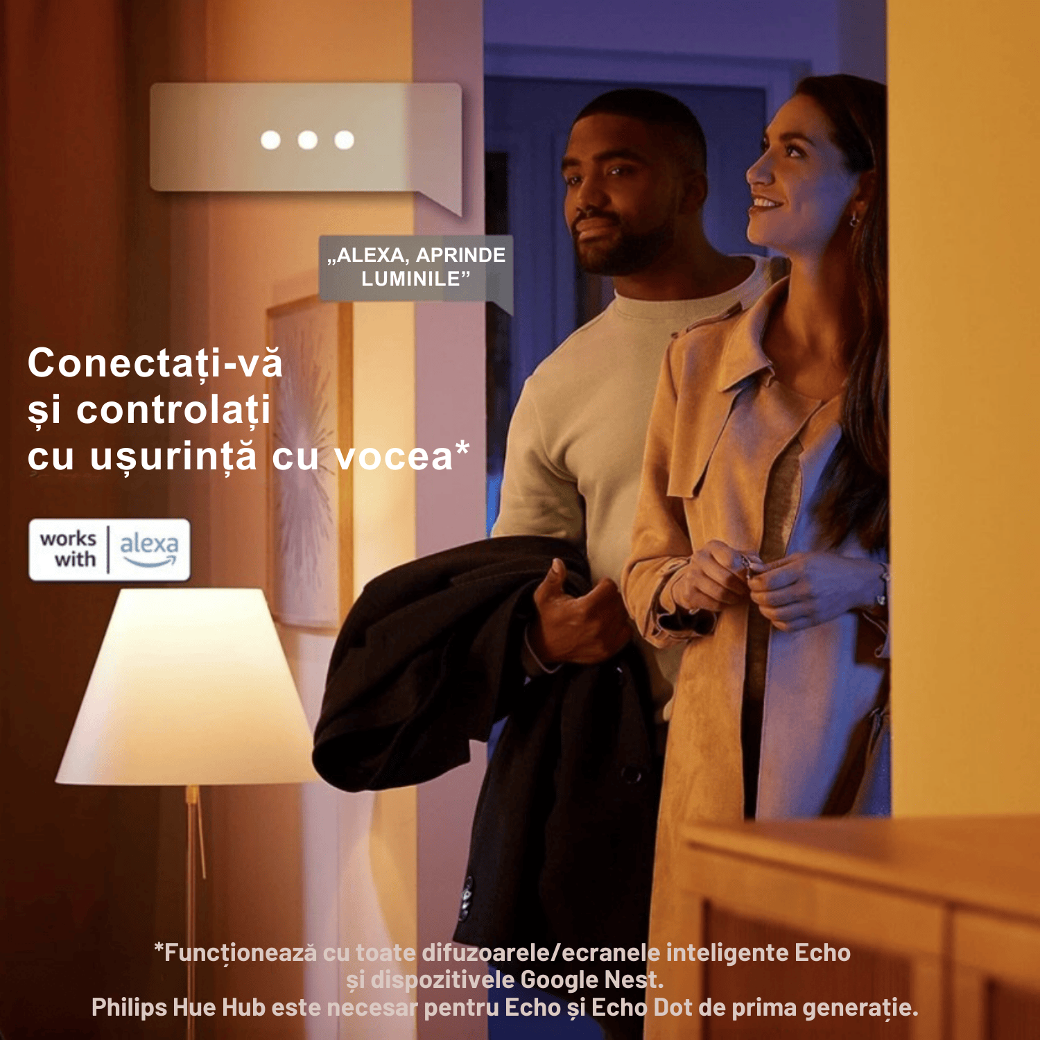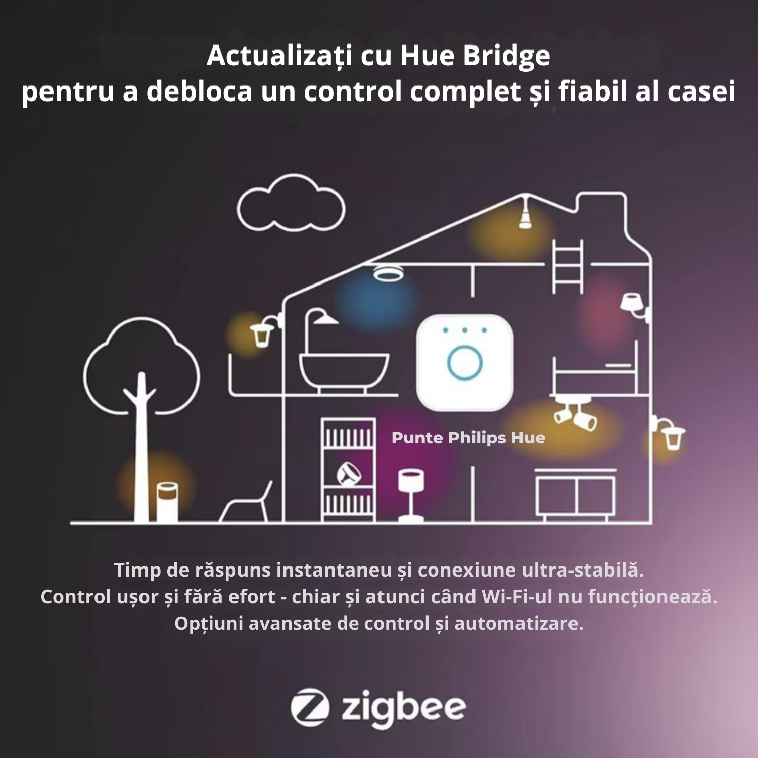 • Adauga un Philips Hue Bridge ( vandut separat, optional ) pentru controlul complet al casei. Acest hub / BRIDGE va ofera control si acces total asupra dispozitivelor din aceasta gama ,cand sunteti acasa, fie in deplasare.