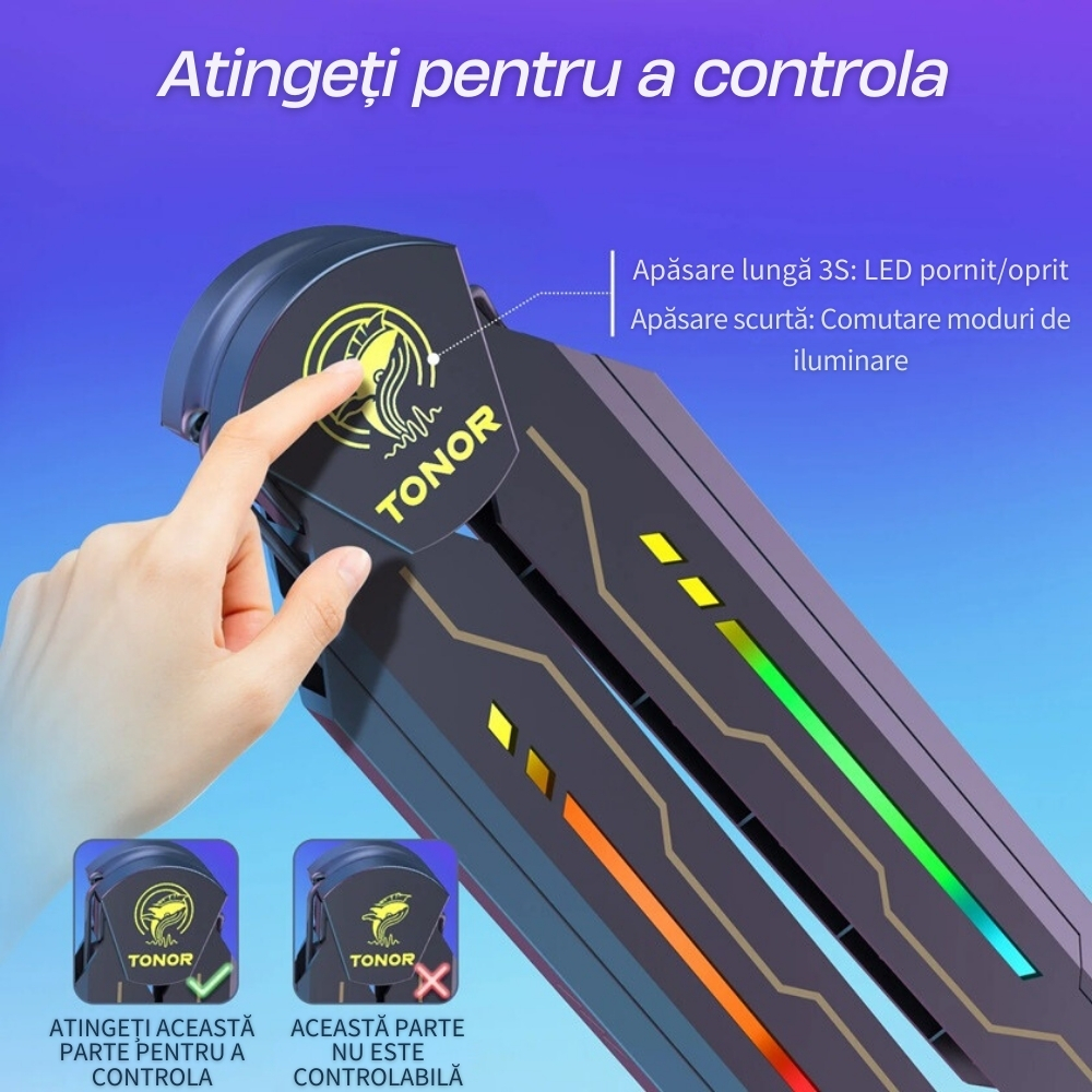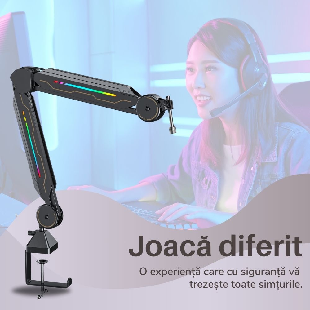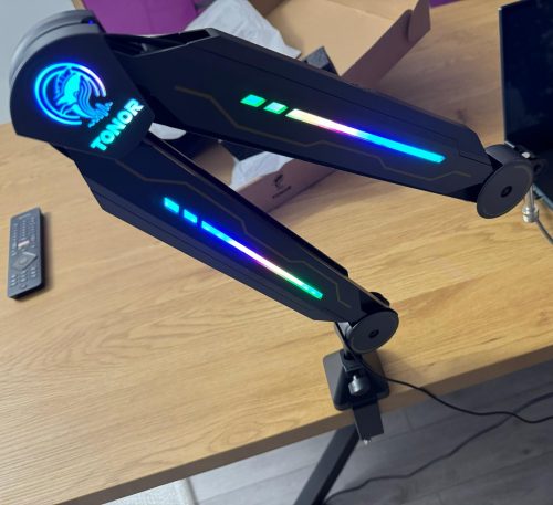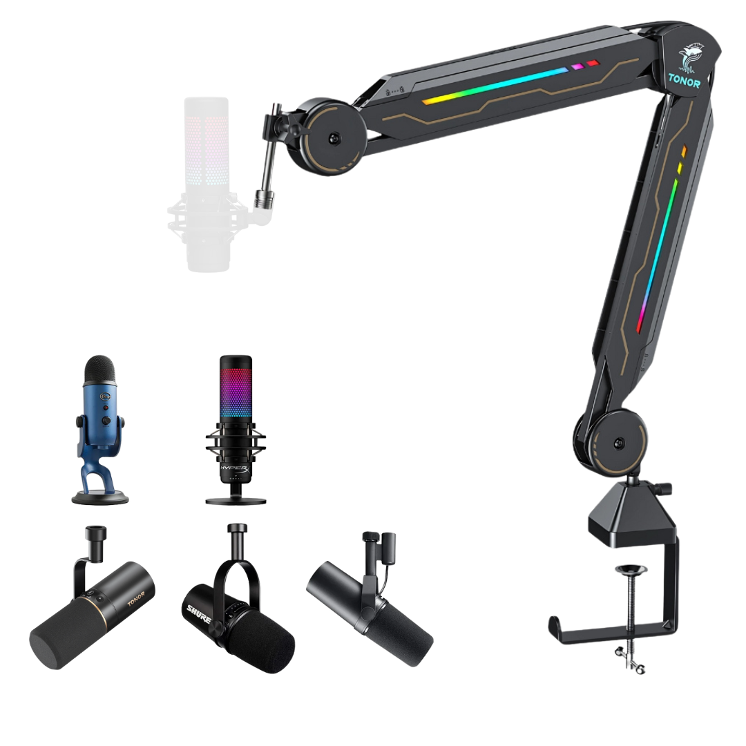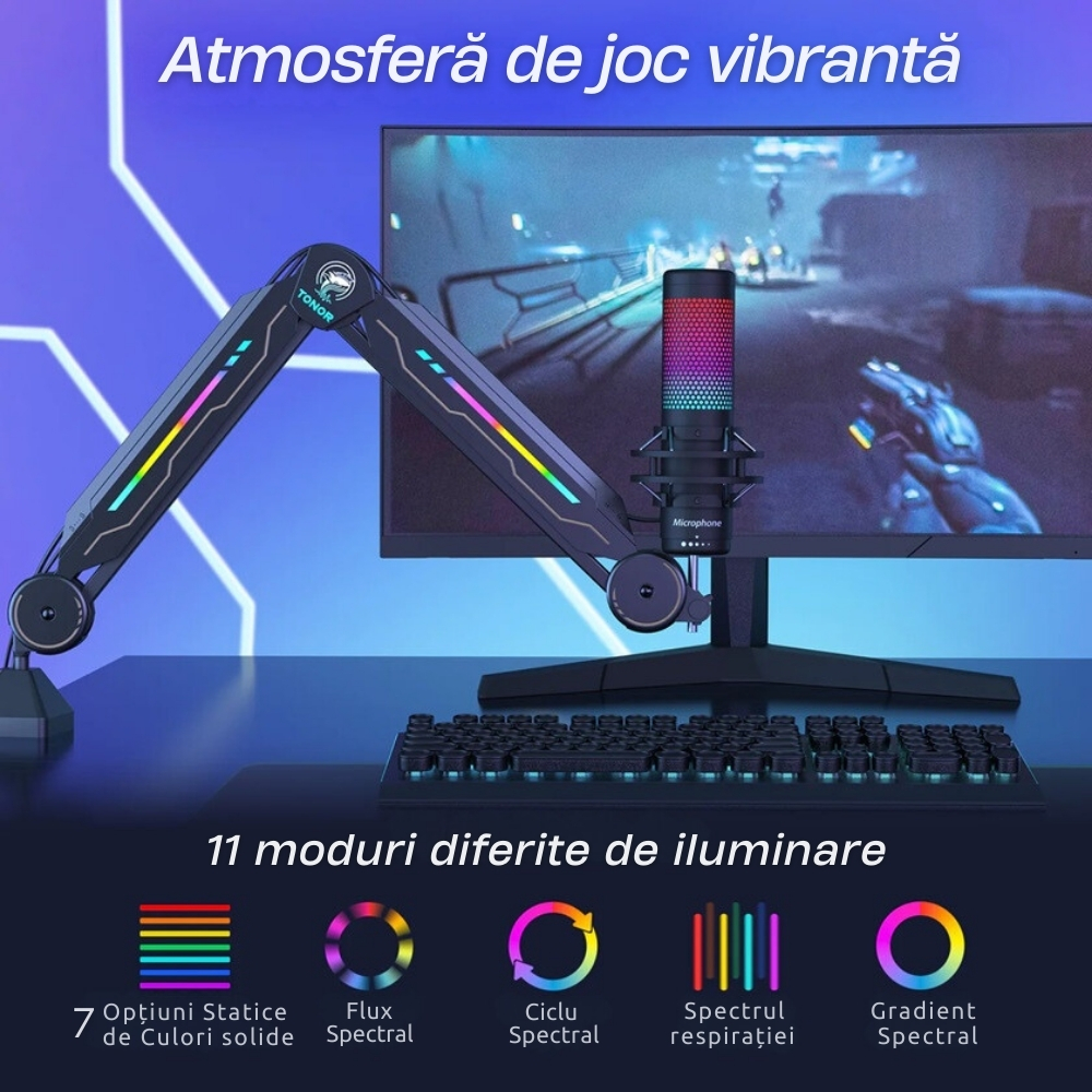 - Standul pentru microfon Tonor T90 RBG adauga un plus de stil si efecte de lumina colorata biroului de jocuri, creand o atmosfera impresionanta si vibranta.