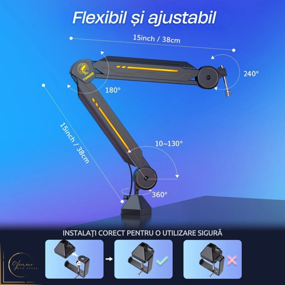 - Flexibil si Ajustabil: Acest brat microfon are o excelenta raza de actiune, permitandu-va sa-l reglati liber cu rotatie 360° si intindere 180°.